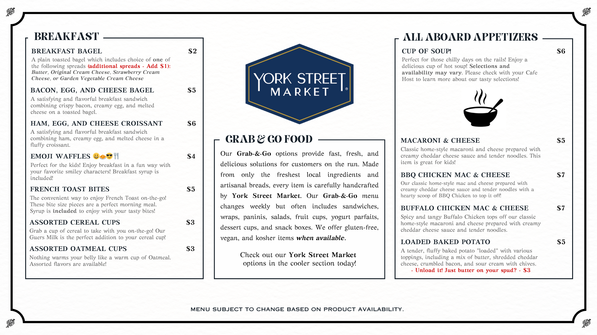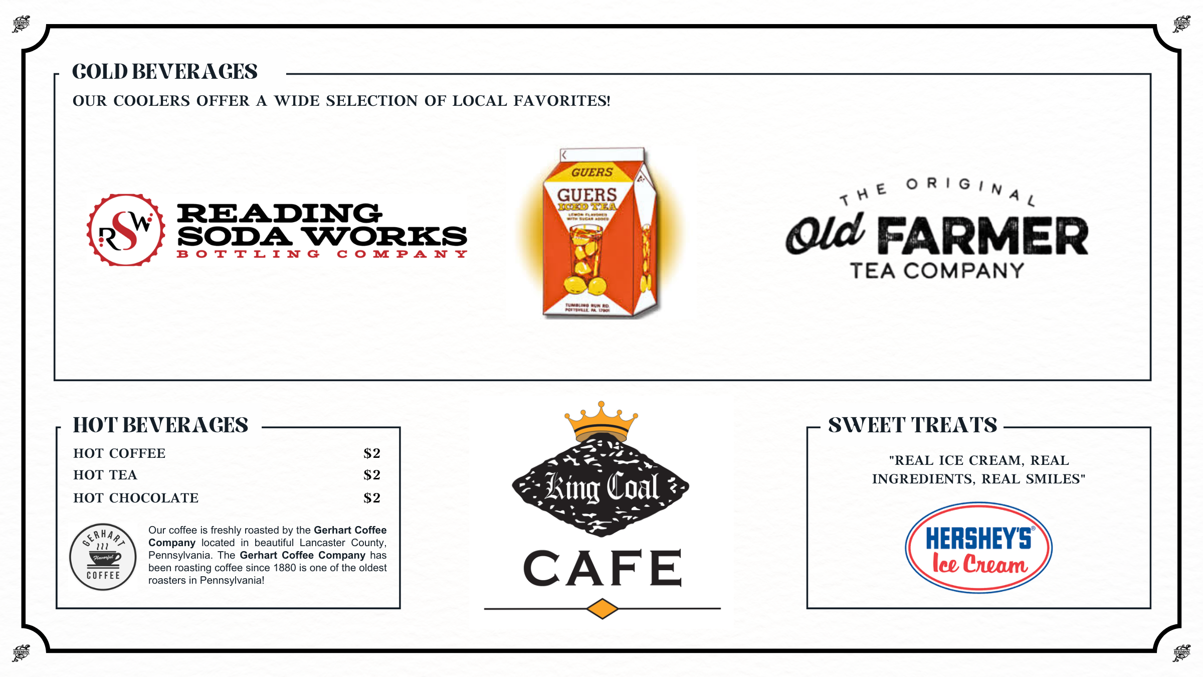 We offer a wide variety of hamburgers, cheeseburgers, hot beverages, cold beverages, chips, candy, cookies, cereal, cold treats, local iced tea, souvenirs, and much more!