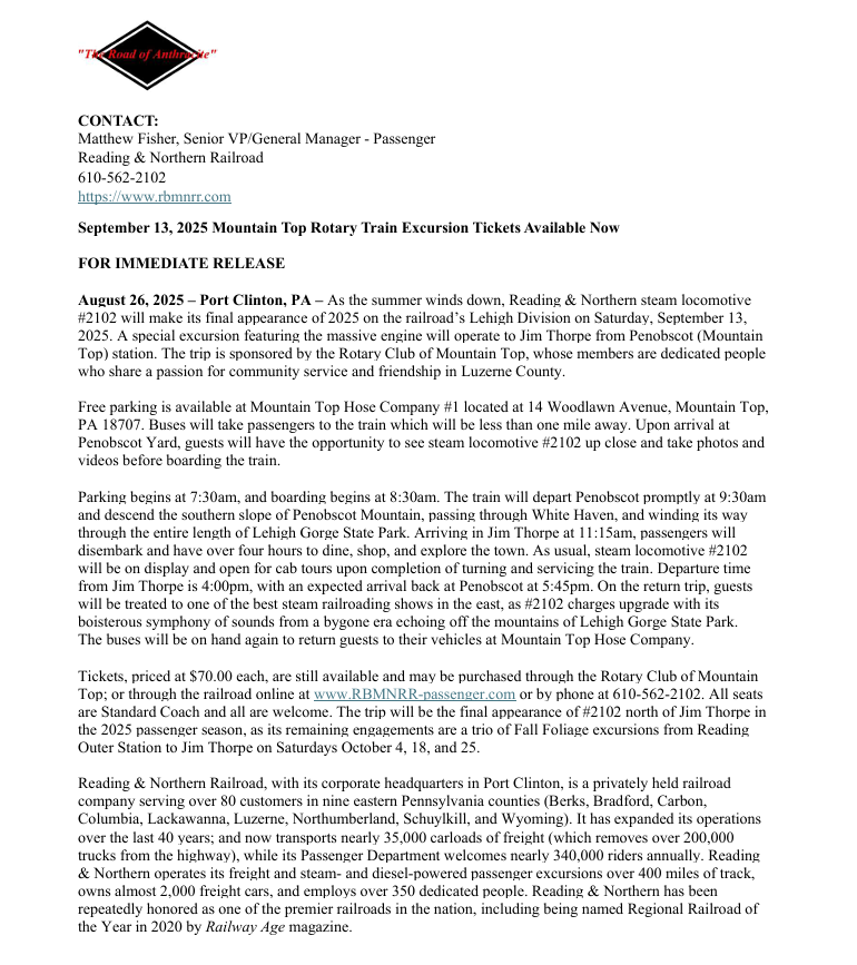 September 13, 2025 Mountain Top Rotary Train Excursion Tickets Available Now Matt LiptakSeptember 4, 2025 Facebook0 Twitter Tumblr Pinterest0 0 Likes